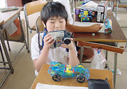 | 自分が車のおもちゃに乗っているところを合成しようとして写真を撮るこども |