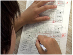 子どもたちは、今日学んだことを自己評価カードに記入していきます。教師は、授業の後に自己評価カードの評価を行います。良い記述には、印をつけます。