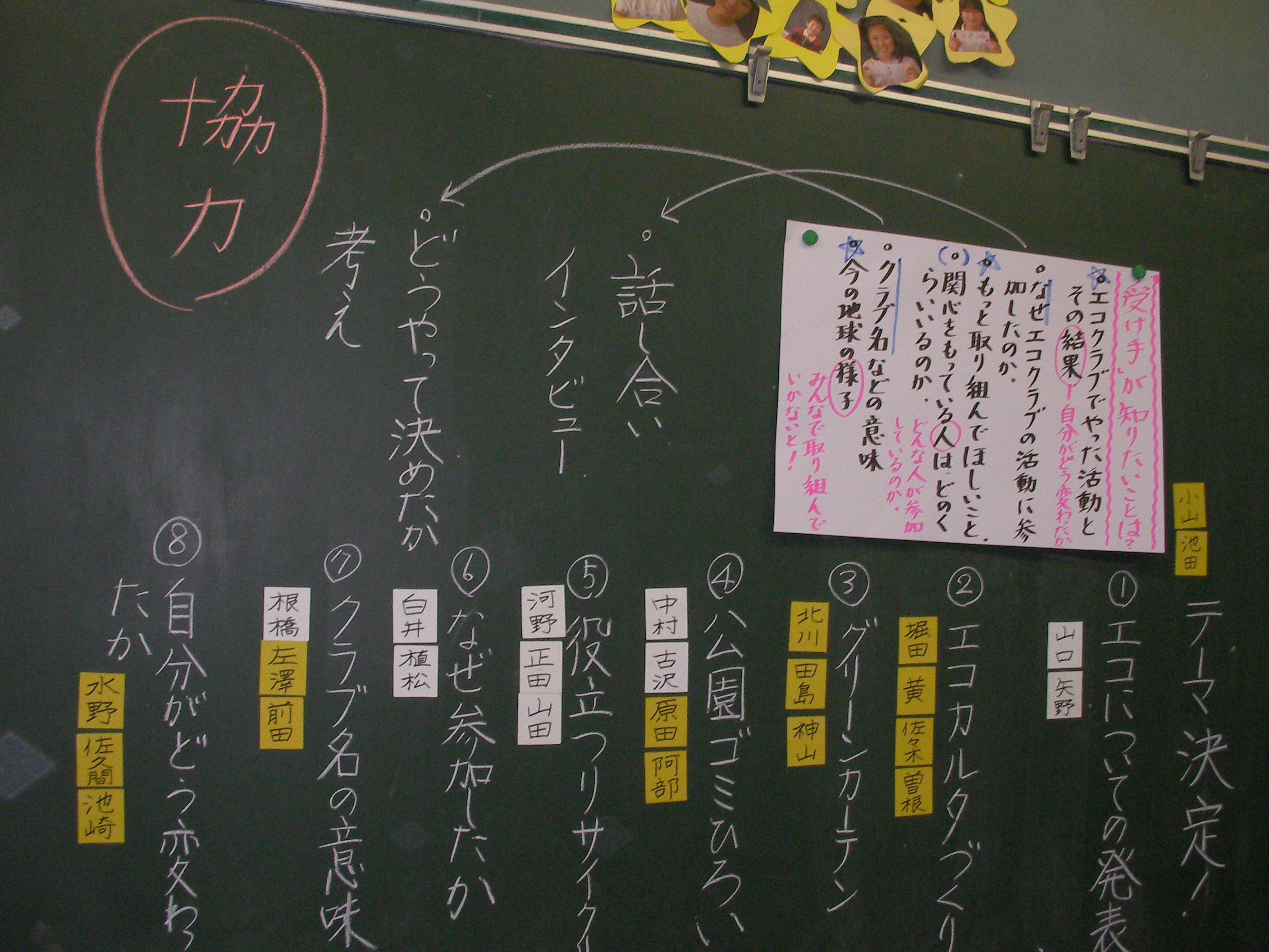 学習のねらい:発信する相手や目的を考え、エコ新聞を作るためにみんなで分担する。 メディア創造力育成ポイント:発信する相手や目的を考えて,話し合っている。 準備する物:これまでの「総合的な学習の時間」に実施してきたことが分かるような資料(ここでは,板書の写真を提示)