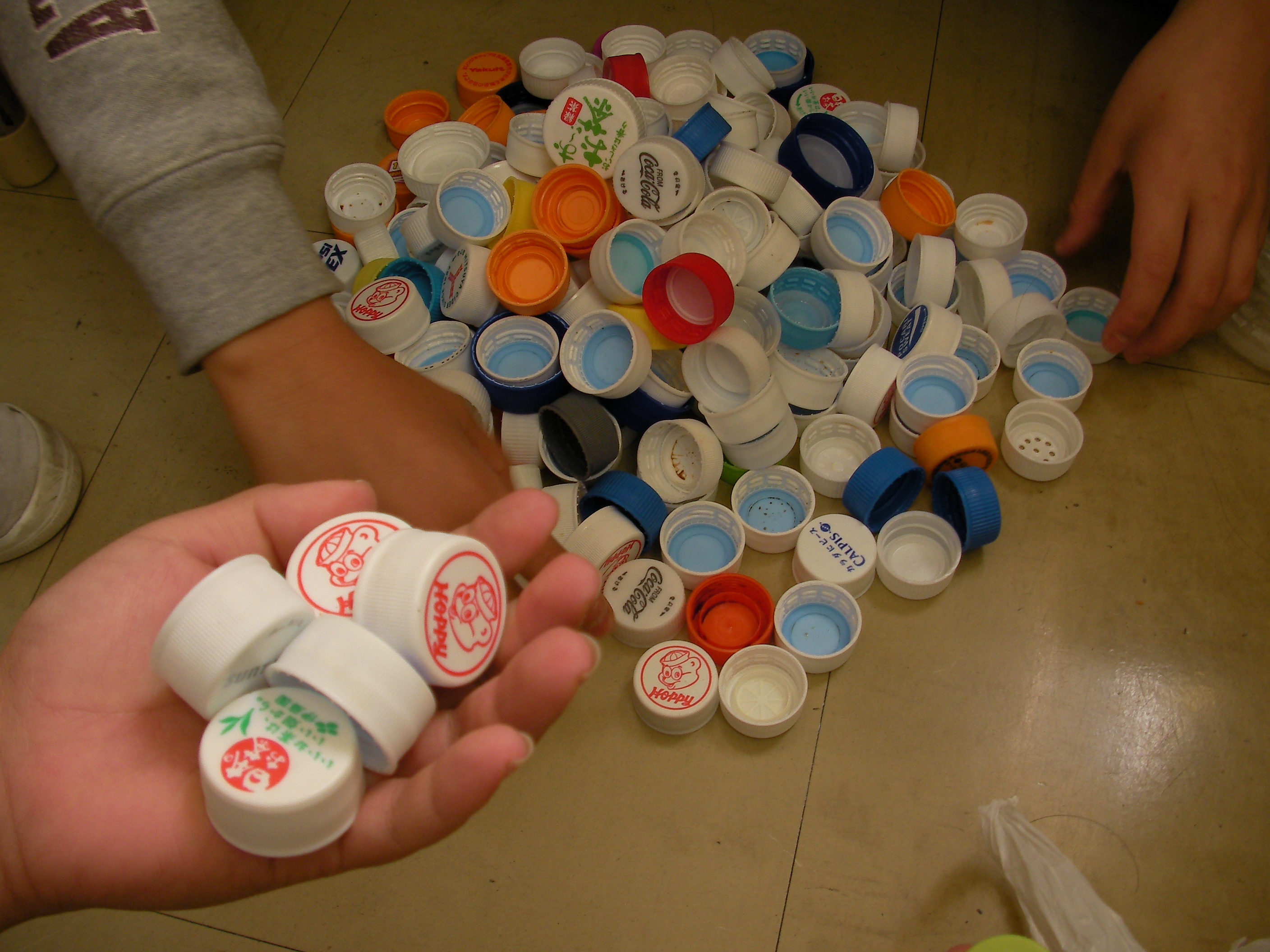 事実を伝えなくてはいけないと、電子情報ボードを活用してみんなでWebページを読み、何を伝えようか検討していました。その後、集まったキャップを床に並べて写真を撮るなどしていました。教師は、活動が進んでいるのでそのまま見守りました。
